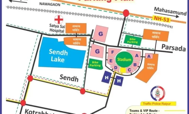 पासधारी वाहनों के लिए मार्ग एवं पार्किंग : पासधारी वाहन जिन्हें पार्किंग पास A, B, C, D, E, F, G जारी हुआ है, वे सेरीखेड़ी ओवरब्रिज होकर नया रायपुर प्रवेश मार्ग से स्टेडियम टर्निंग, डॉ. खूबचंद बघेल चौक, कयाबांधा चौक (सेक्टर 15/21), कोटराभाठा चौक (सेक्टर 17/20) से ग्राम सेंध, सेक्टर 04/10 होकर स्टेडियम पार्किंग A, B, C, D, E, F, G में अपना वाहन पार्क कर सकेंगे।