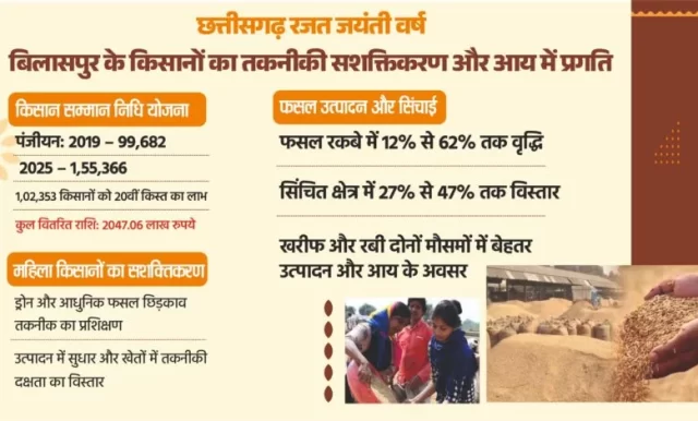 छत्तीसगढ़ रजत जयंती वर्ष में कृषि योजनाओं का प्रभावी क्रियान्वयन, तकनीकी प्रशिक्षण और किसानों की सक्रिय भागीदारी बिलासपुर जिले को कृषि विकास के मार्ग पर मजबूती से आगे ले जा रही है और किसानों की आर्थिक स्थिति को सुदृढ़ बना रही है।