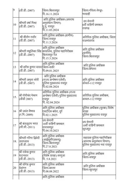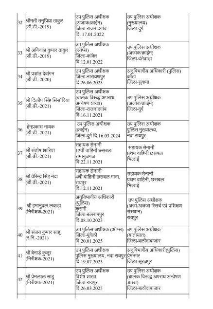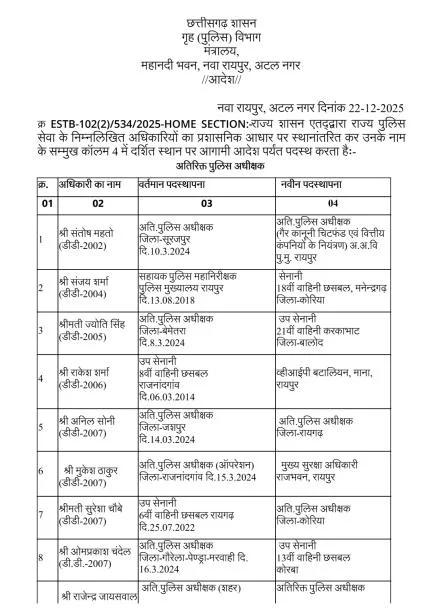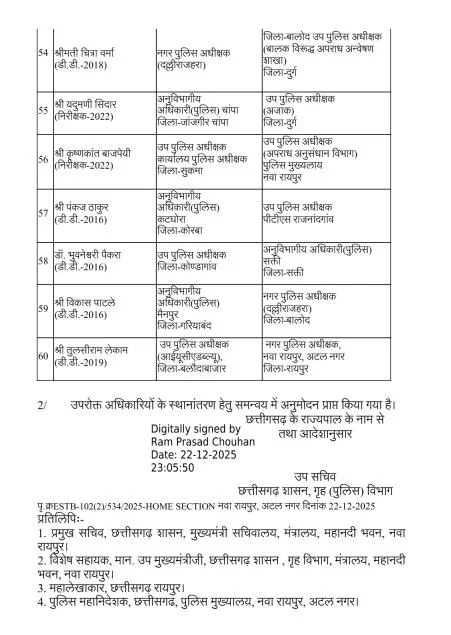 Home छत्तीसगढ़ पुलिस महकमें में बड़ी सर्जरी : 95 एएसपी और डीएसपी का तबादला छत्तीसगढ़राज्य पुलिस महकमें में बड़ी सर्जरी : 95 एएसपी और डीएसपी का तबादला By Desk Reporter - December 23, 2025 57 0 FacebookTwitterPinterestWhatsApp रायपुर। राज्य सरकार ने पुलिस मकहमे में बड़ी सर्जरी करते हुए राज्य पुलिस सेवा के 95 अधिकारियों का तबादला किया है। गृह (पुलिस) विभाग की ओर से जारी आदेश के मुताबिक 35 अतिरिक्त पुलिस अधीक्षक और 60 डीएसपी स्तर के अफसरों को इधर से उधर किया गया है।