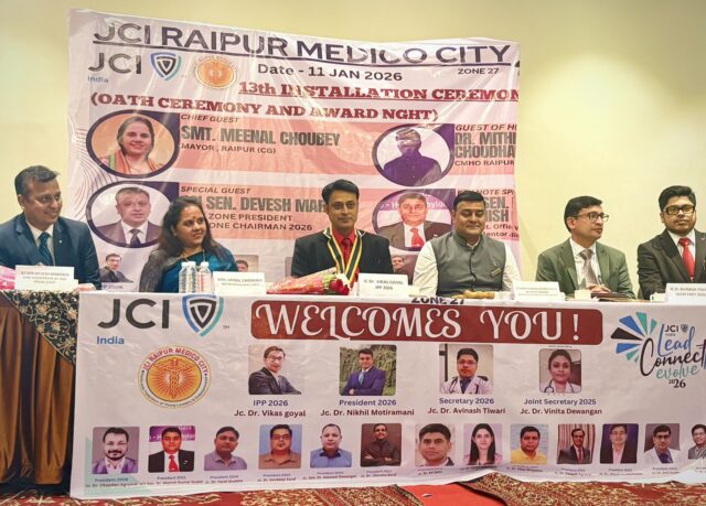 जेसीआई रायपुर मेडिको सिटी चैप्टर विगत कई वर्षों से रायपुर में अपनी सोशल और ऐकडेमिक रूप में दे रहा है। रविवार को इस साल २०२६ की नई कार्यकारिणी का पदग्रहण समारोह आयोजित किया गया । डॉ निखिल मोतीरमानी ने अध्यक्ष और डॉ अविनाश तिवारी ने सेक्रेटरी पद पर अपना प्रभार ग्रहण किया । डॉ निखिल मोतिरामानी एक हृदय रोग विशेषज्ञ है और अपनी सेवायें मोतीरमानी हार्ट क्लिनिक शंकर नगर में डायरेक्टर के रूप में कार्यरत है।इस कार्यक्रम की अध्यक्षता मुख्य अतिथि के रूप में हमारे रायपुर के महापौर श्रीमती मीनल चौबे जी ने की । उन्होंने सभी डॉक्टर के बीच अपने विचार रखे । कार्यक्रम में गेस्ट ऑफ़ ऑनर जेसी देवेश मरोड़िया जी ने की जो अभी जे ए सी के जोन चेयरमैन है । २०२५ के अध्यक्ष डॉ विकास गोयल ने साल भर हुई गतिविधियों की जानकारी दी और सभी सदस्यों का सम्मान किया । इस संस्था द्वारा समाज में पहुँच कर सेहत के देखभाल के लिए कैम्प आयोजन करना, नवीन तकनीकी के बारे में संघोष्टिया और बाकी अन्य कार्यक्रम आयोजित किए जाते है। जॉइंट सेक्रेटरी के पद पर डॉ विनीता देवांगन ने पद ग्रहण किया । इस कार्यक्रम में डॉ मनीष गुप्ता , डॉ जितेंद्र सराफ, डॉ अनिल गुप्ता , डॉ सुमेधा श्रीवास्तव, डॉ के के साहू , डॉ आनंद बंसल, डॉ विकास भोजसिया और शहर के अनेक डॉक्टर उपस्थित थे।