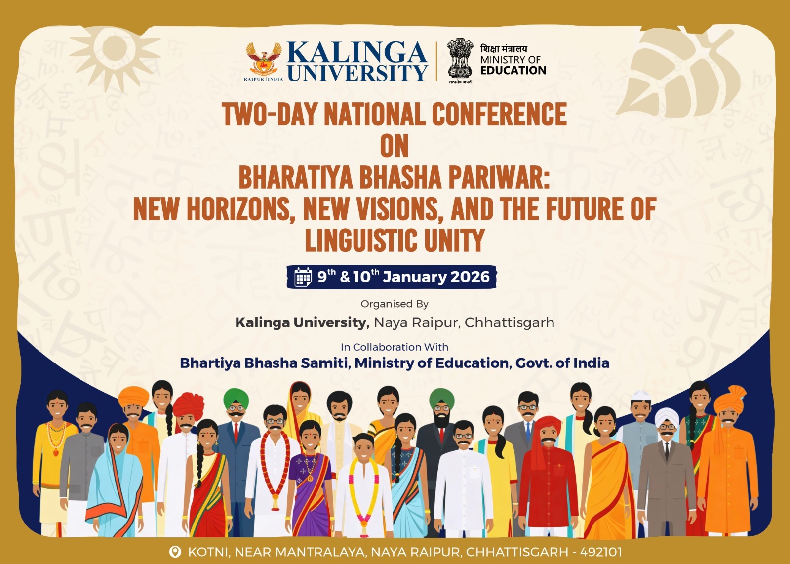 रायपुर: भारतीय भाषा समिति (शिक्षा मंत्रालय, भारत सरकार) एवं कलिंगा विश्वविद्यालय के संयुक्त तत्वावधान में “भारतीय भाषा परिवार: नए क्षितिज, नई दृष्टि और भाषाई एकता का भविष्य” विषय पर दो दिवसीय राष्ट्रीय संगोष्ठी का आयोजन 9–10 जनवरी, 2026 को किया गया।