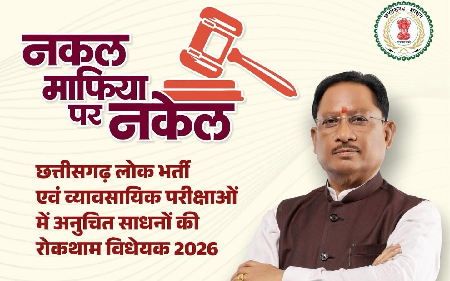 रायपुर, 20 मार्च 2026/ छत्तीसगढ़ विधानसभा में आज छत्तीसगढ़ (लोक भर्ती एवं व्यावसायिक परीक्षाओं में अनुचित साधनों की रोकथाम) विधेयक, 2026 को पारित किया दिया। इस विधेयक के माध्यम से राज्य में आयोजित होने वाली भर्ती एवं प्रवेश परीक्षाओं को अधिक पारदर्शी, सुरक्षित और विश्वसनीय बनाने की दिशा में एक महत्वपूर्ण कदम उठाया गया है।